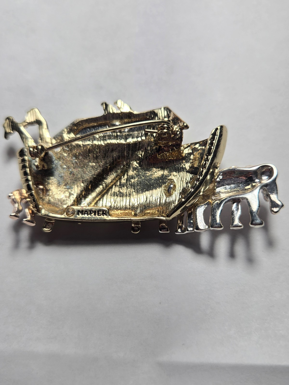 The Noah's Ark Silver Gold Tone Brooch Pin by Napier features a charming design with animals such as flamingos and giraffes. The combination of gold and silver tones adds a touch of elegance to any outfit, making it a versatile accessory for those who appreciate animal-themed jewelry. The Napier brand ensures quality and craftsmanship in this stylish brooch pin. It's pre-owned and sells as is.